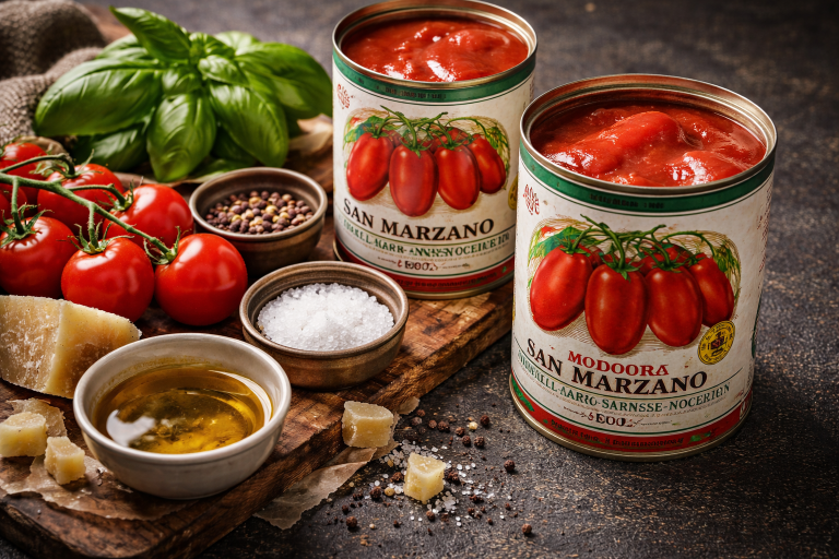 Für die Tomatensoße verwenden wir ausschließlich originale San-Marzano-Tomaten aus Italien. Sie gelten als